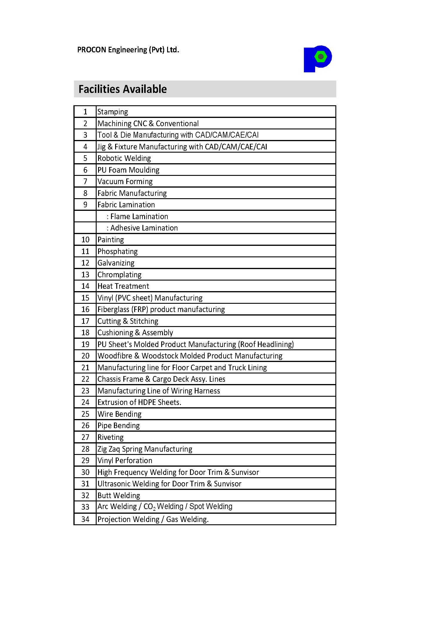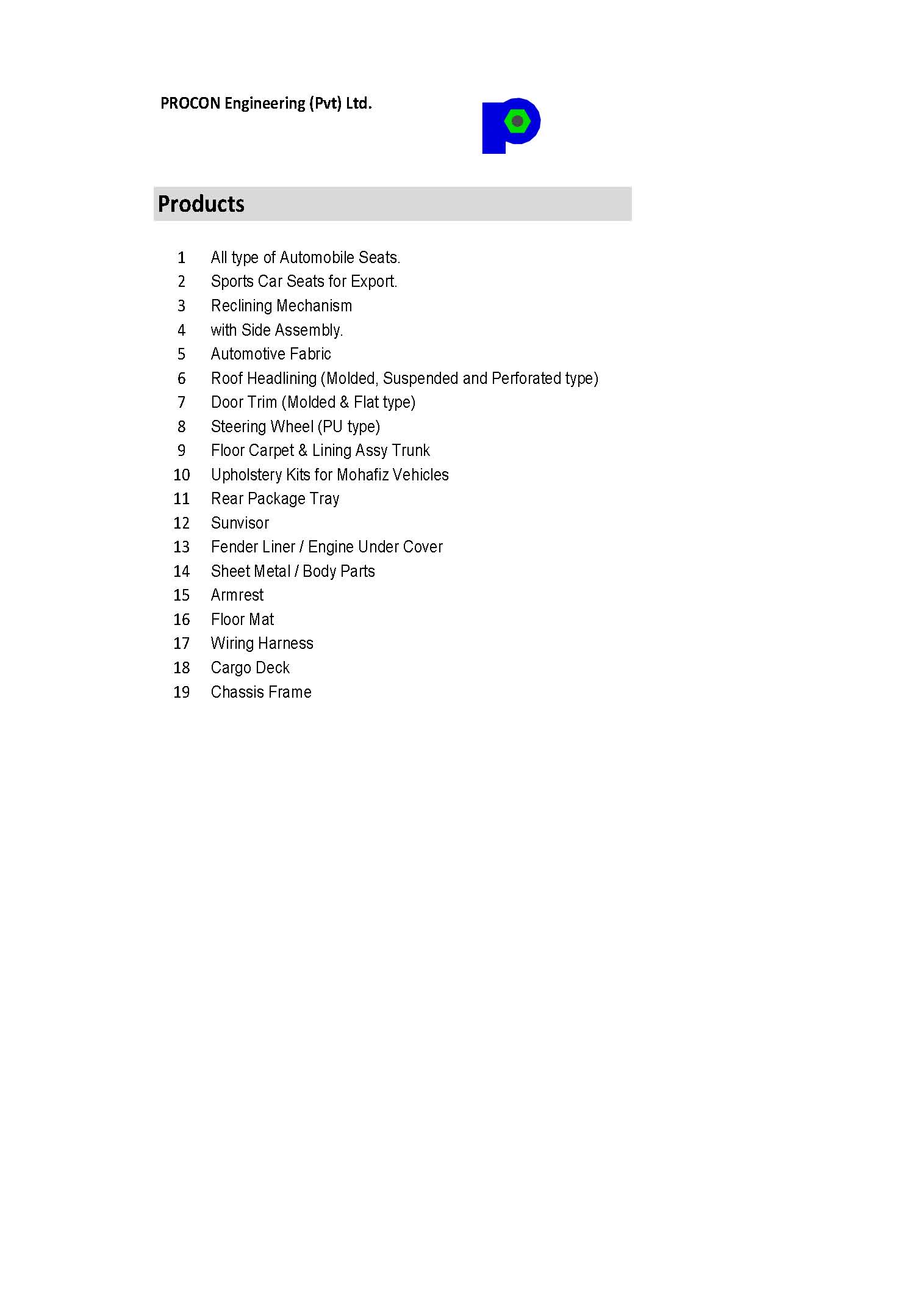 Master Group instituted a manufacturing automotive interior Industry, Procon Engineering (Pvt) Ltd., the first of its kind with state-of-the-art self-reliant composite manufacturing facilities in Karachi & Lahore on a cumulative area of a colossal 78,015 square meters. Procon is IATF 16949:2016, ISO 9001:2015 and ISO 14001:2004 certified company supplies high quality products to car, van, pickup, truck, bus, motorcycle and tractor manufacturers. Procon has the distinguished honor of exporting Sports Car Seats to USA, Europe and Japan. Procon has high Stamping Facility (for sheetmetal parts) with a wide range of Presses between 100 ton to 1300 ton capacity. It has inhouse Tool & Die manufacturing facility for Dies Jigs & Fixtures. It has the capability to fulfill any requirement for automotive interiors and other components.